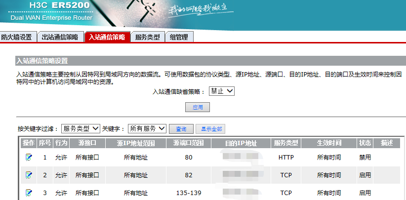 当路由器工作于NAT模式下时(即开启了NAT功能),入站通信缺省策略不允许配置,且仅为“禁止”;当路由器工作于路由模式下时(即关闭了NAT功能),入站通信缺省策略才允许选择配置,且缺省情况下为“允许”