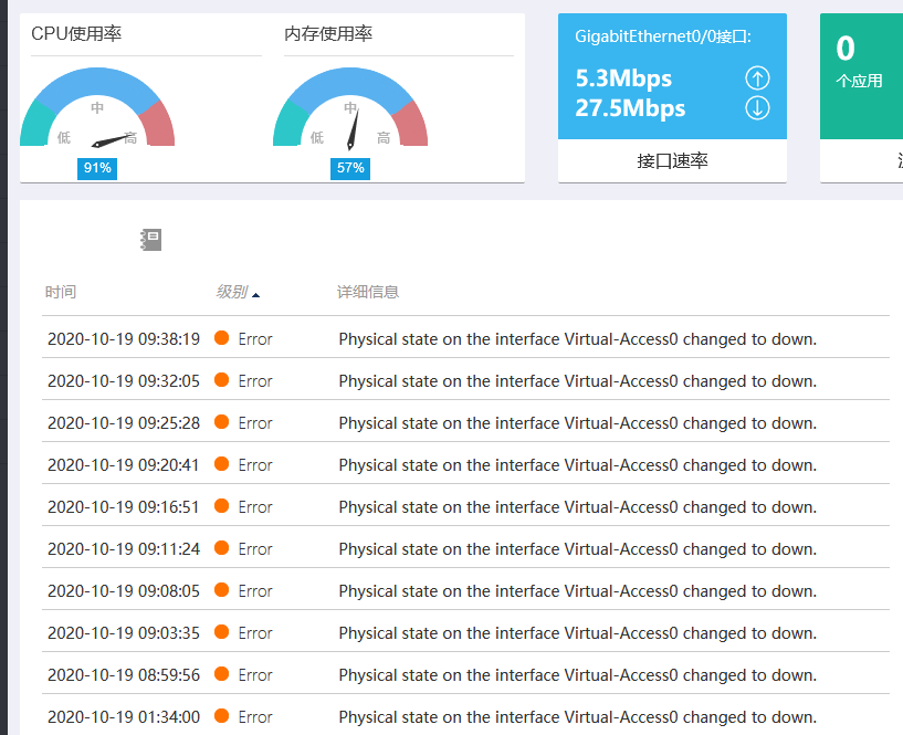 1、最近网络波动很明显,偶尔会断网,MSR2600CPU占用率很高,查看日志发现interface Virtual-Access0,interface Virtual-Access1口会翻动,在一段时间内不断UP DOWM,以及日志出现shell failed to log in from 58.21.146.180,或者其他IP地址, The usage of security log file flash:/seclog/seclog.log reaches 80%.等日志大量出现。telnet检查时命令行有明显卡顿。同时查看CPU占用较高。但内存占用一般。
