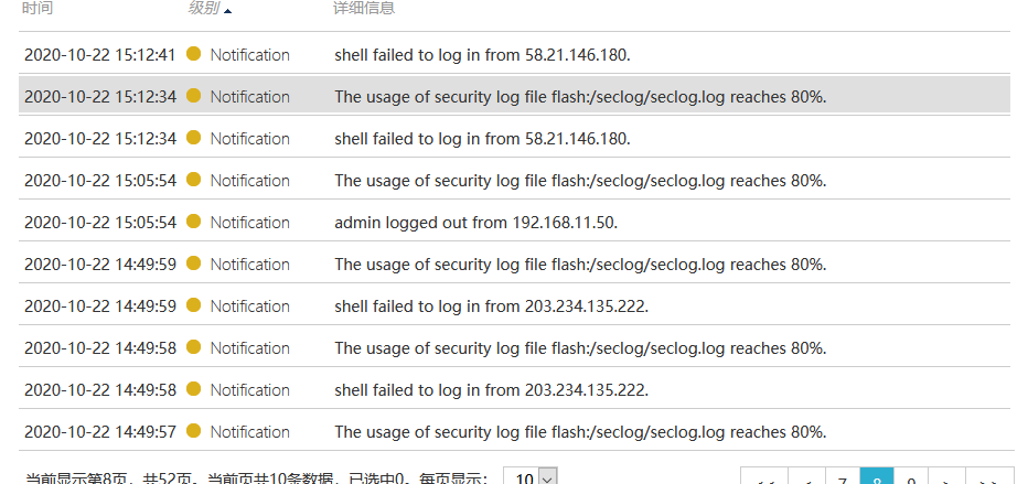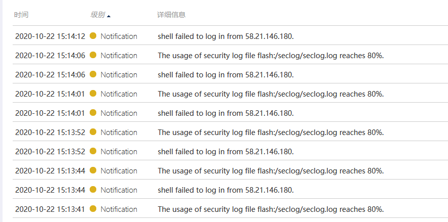 同时看到有主机在尝试登陆路由器,可以根据日志反馈的IP在ACL内进行拦截看下。为了保证设备的安全,建议使用复杂度高的密码。