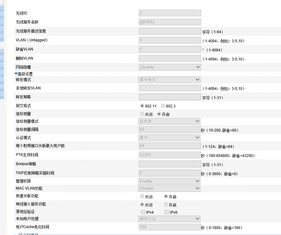 我想实现整个办公区无缝漫游,设备连接同一个名称的SSID,从一个无线ap切换到另外一个无线ap能够快速接入(延时一两秒都可以接受),但实际情况非常不理想,不单单是无缝漫游效果不理想,就算手机固定位置使用,不但网速慢,而且还出现无网络现象,此时查看wifi是连着无线热点的,但ping不通无线ap分配的静态ip,此时需要关闭手机wifi再打开才能联网,或者在ac控制面板断开我手机连接,手机自动重连后才能上网, 亦或者等好久之后,才能上网,但上网效果一直不理想,网速慢、无网络访问这样的现象反反复复,有时候还出现笔记本连接无线后,过会就自动断开现象(多台反馈)。