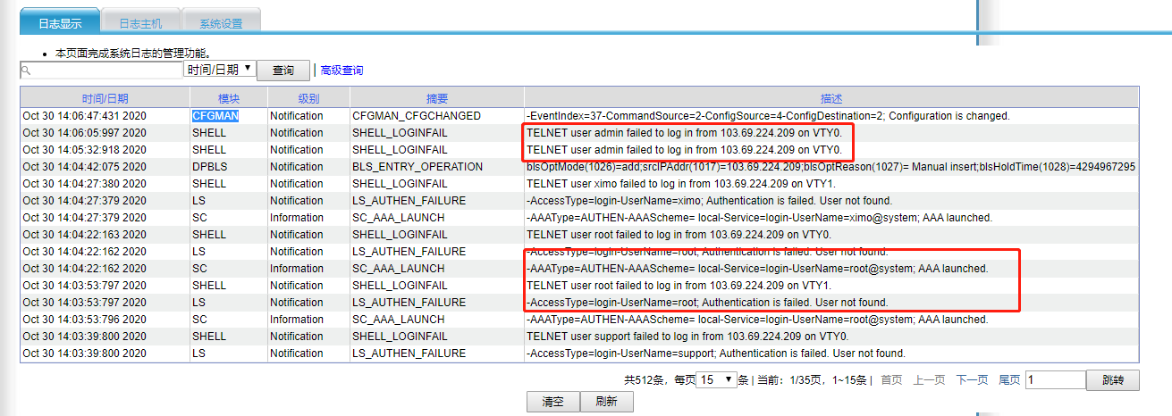 都是外网地址尝试登陆,但都登陆失败了,有可能存在攻击行为,量少的话可以无需关注,措施的可以加强密码复杂度或配置ACL限制登陆地址。