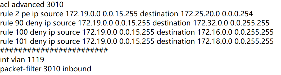 现场是两台S7003堆叠,网关和dhcp都做在s7003E上,现在需要无线访客WiFi vlan1119(172.19.15.254/20)不能访问其他172.16.0.0段, 在7003E上做了acl 源地址vlan 1119网段目的网段为其他172.16段,并应用在vlan1119接口inbound方向,但是发现acl不生效,但是在华三HCL模拟器上做实验是可以的,这是会是什么原因呢?