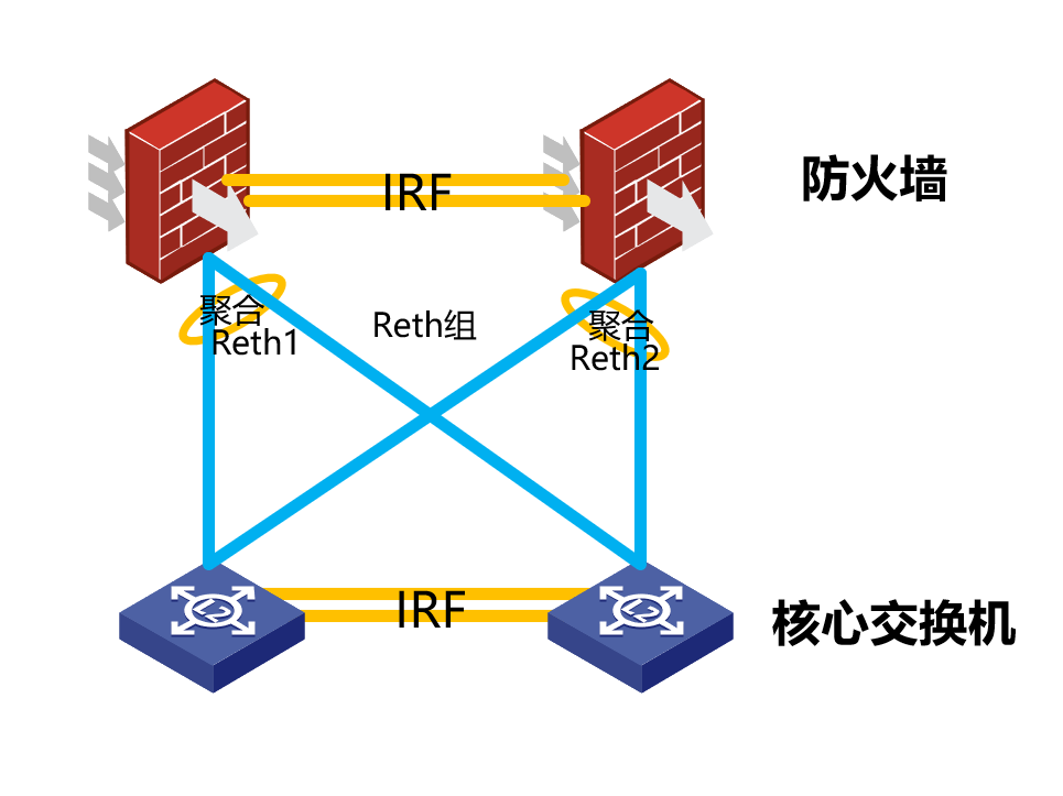 两台防火墙做了IRF,核心到防火墙使用交叉线互连,按图中这种方式可以吗,防火墙两条两条做聚合,两个reth口放到一个reth组里,核心也做2个聚合放到同一个vlan里,我怎么听说防火墙不能做聚合,流量来回有问题