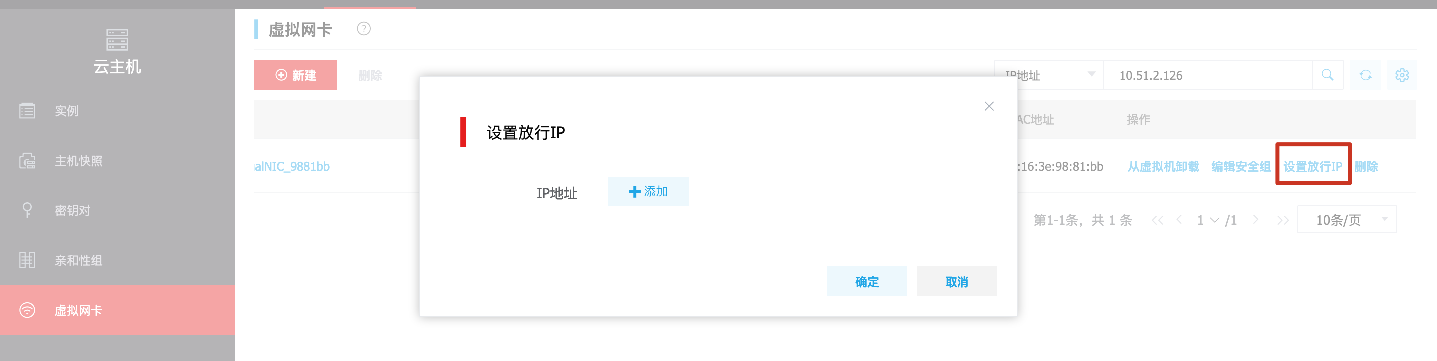 本操作用于设置虚拟网卡除自身IP地址外其他可通信的IP地址,即为网卡设置第二个IP地址。若绑定了虚拟网卡的云主机在某场景下需要临时使用其他IP地址进行通信,需将该IP地址设置为放行IP。当云主机不再使用该IP地址时可删除放行IP,释放资源。