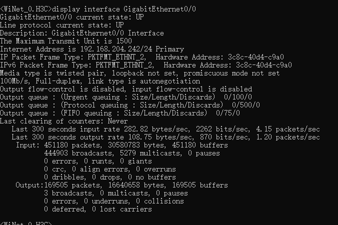 | GigabitEthernet0/0 | 手动指定IP | 已连接 | 192.168.204.242/255.255.255.0 | -- | 0 | 2 | 100Mbps/全双工 |