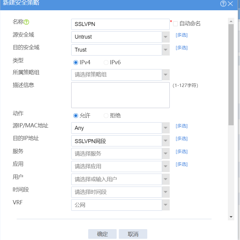 import interface SSLVPN-AC1口放trust域了,域间策略要怎么配?