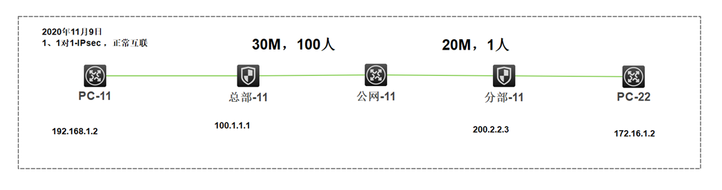1、客户总部与分部之间,使用 IPsec VPN 连接,总部出口为 30M专线,100人办公。分部 出口为 20M 专线,1人办公。