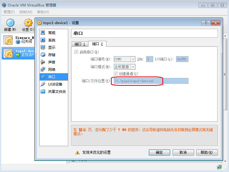 第二步:打开VirtualBox,记录下第一台设备(也就是topo1-device1)的 端口/文件位置(\\.\pipe\topo1-device1)