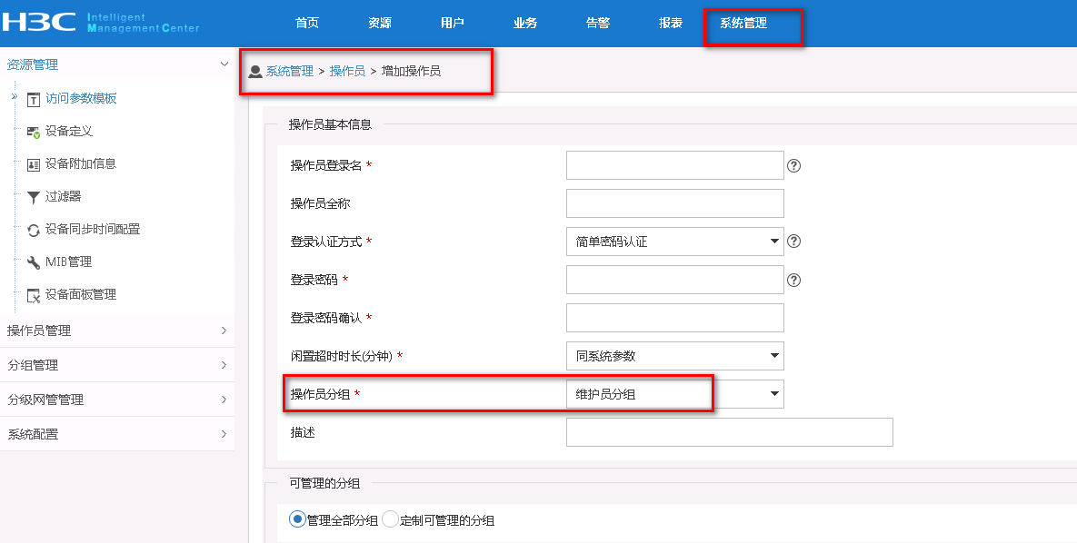 如何增加一个权限小的imc用户。只让他看,只能给设备打检修。不能对设备有其他操作