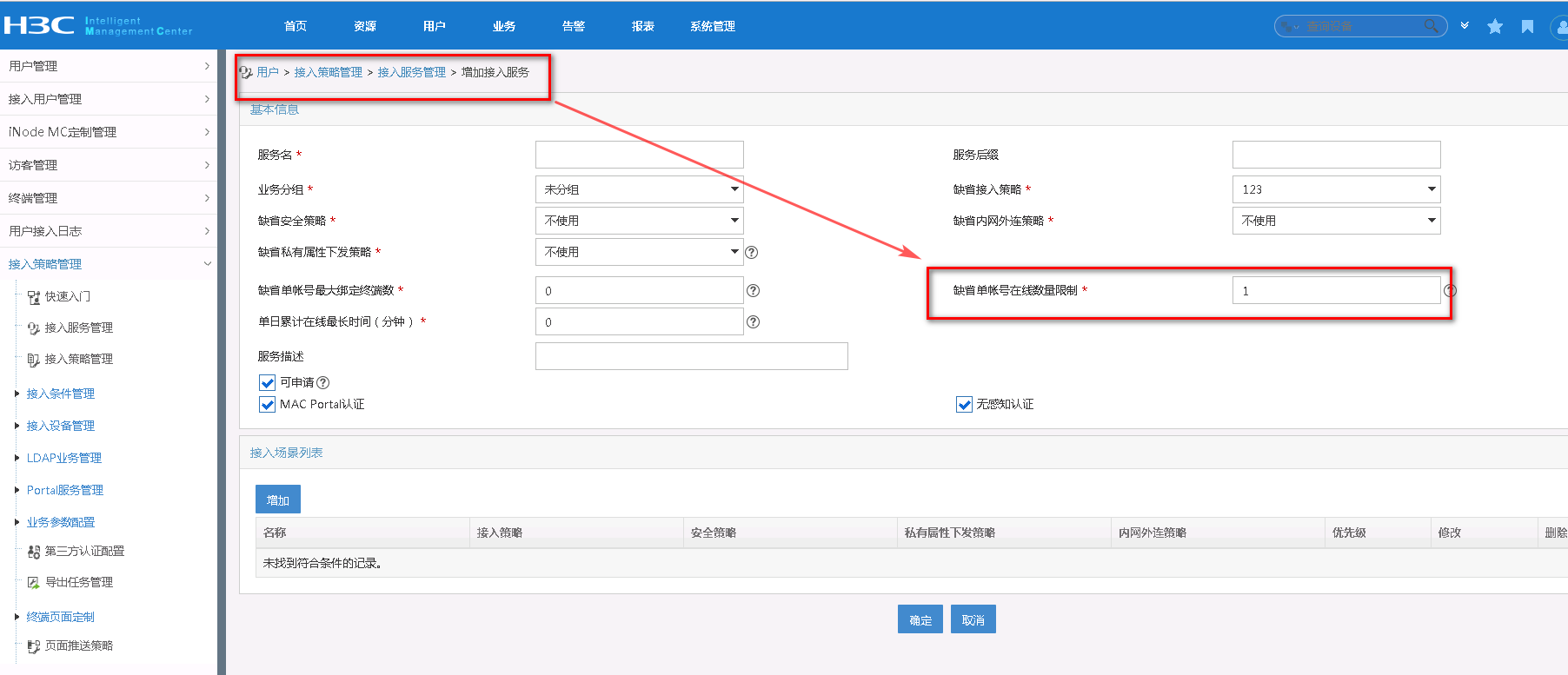 接入用户下面和接入服务下面都有在线数量限制配置,二者相比哪个值小哪个生效,现场对应配置为1即可。