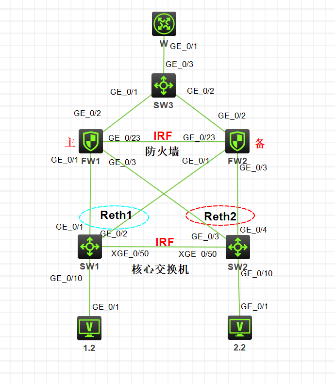 基本组网信息,现有核心交换机2台,防火墙2台都做IRF堆叠;正常流量经过主防火墙转发 ,当主防火墙出现问题是,再由备防火墙转发。