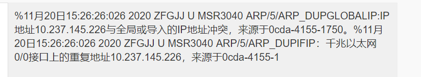 %Nov 20 15:26:26:026 2020 ZFGJJ_MSR3040 ARP/5/ARP_DUPGLOBALIP: IP address 10.237.145.226 conflicts with global or imported IP address, sourced from 0cda-4155-1750. %Nov 20 15:26:26:026 2020 ZFGJJ_MSR3040 ARP/5/ARP_DUPIFIP: Duplicate address 10.237.145.226 on interface GigabitEthernet0/0, sourced from 0cda-4155-1751 怎么解决