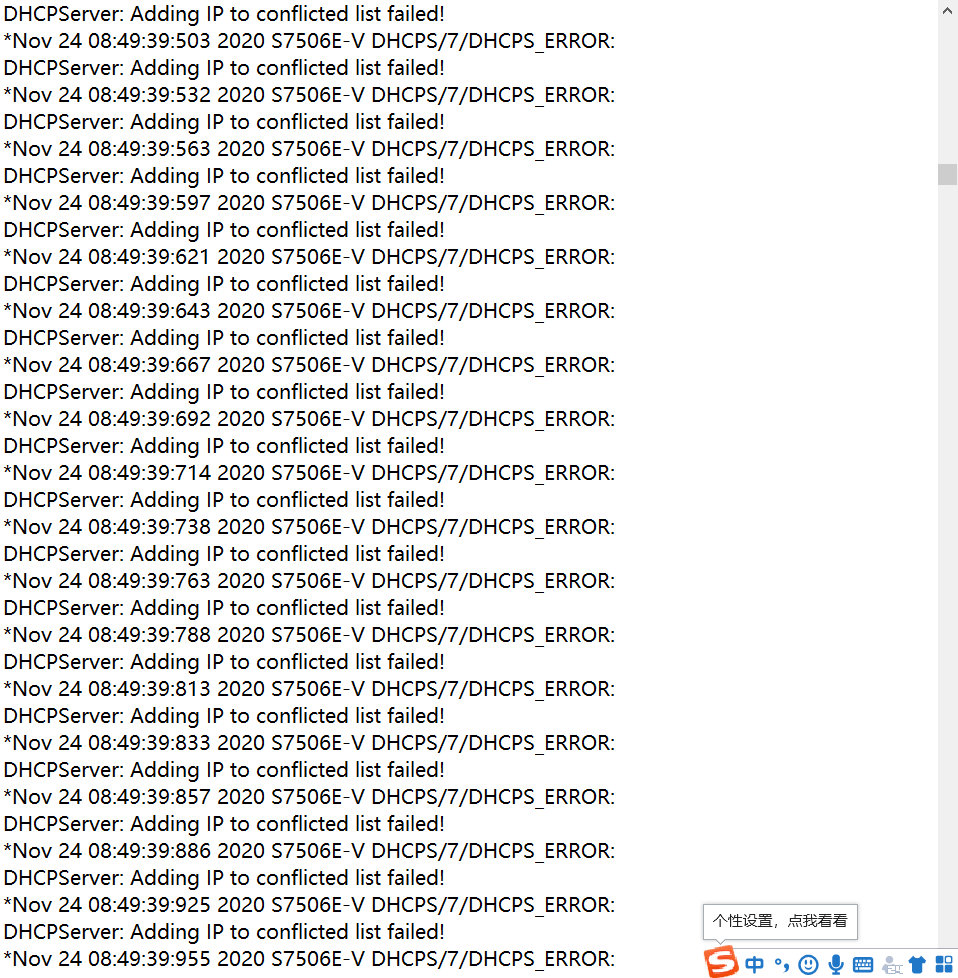 添加IP地址到冲突表项失败,存在大量的IP地址冲突。可以dis arp查看有哪些IP地址在线,同时dis dhcp server ip-in-use看下有哪些在用。