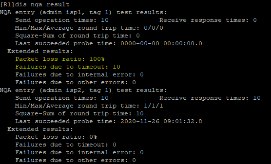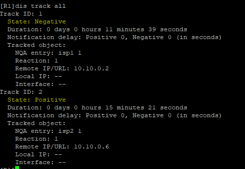 我实在模拟器上做的,我关掉R2,正常NQA会触发track,删除0.0.0.0 0 10.10.0.2路由,但实际路由表还是两条路由: