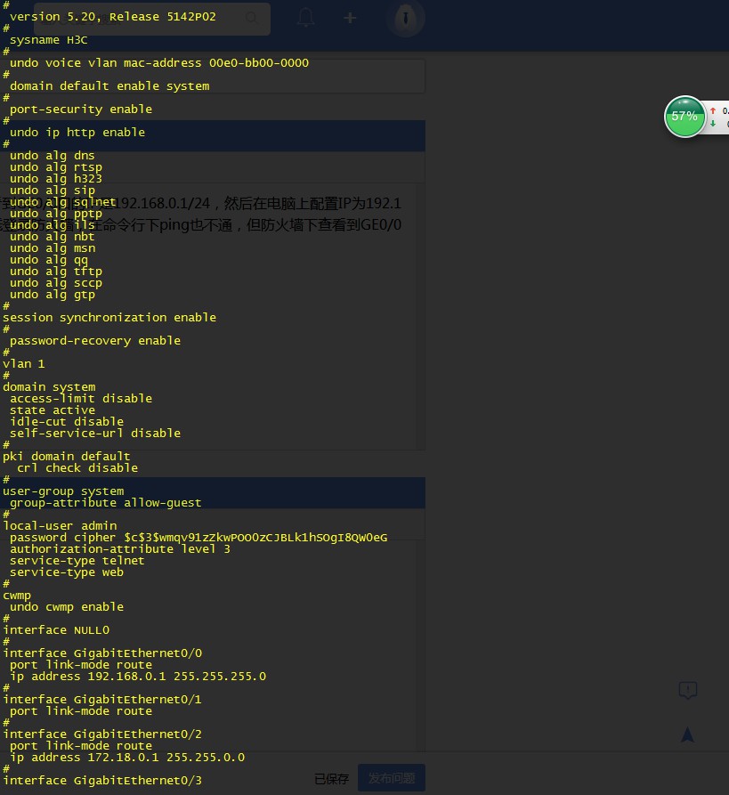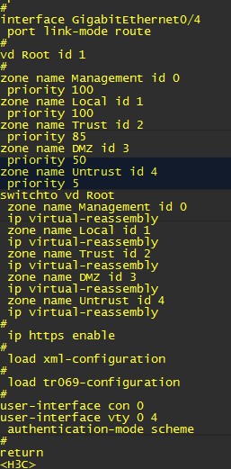 [H3C]zone name Management id 0 [H3C-zone-Management]priority 100 [H3C-zone-Management]import interface GigabitEthernet 0/0 配置好这些命令,ping 管理口的192.168.0.1还是不通