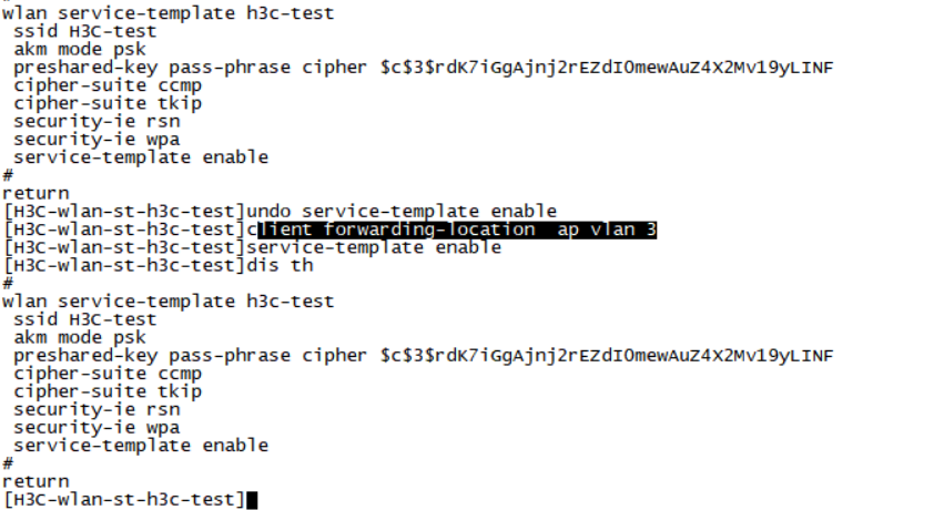 你在服务模板下没有指定终端上线的vlan,AP视图下指定终端上线的vlan为vlan 1,而你开启本地转发生效的vlan是vlan 3,终端上线的vlan 1不会生效,建议把ap视图下的vlan 1改成vlan 3,或者把ap视图下radio 1 的配置改成service-template h3c-text vlan 3