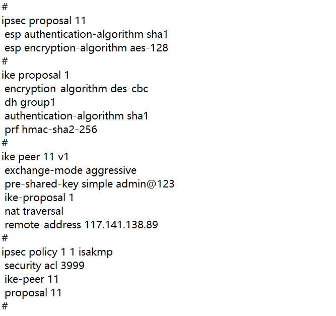 #IKE安全提议默认的认证类型为sha1,加密类型为DES-CBC,DH组为DH1,所以不需要配置也存在这些参数。