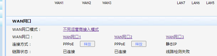 两条电信PPPOE ,一条联通专线。不知道问题出在哪里,是这个设备不支持吗 WAN口 23互换也不行,只能单运营商吗