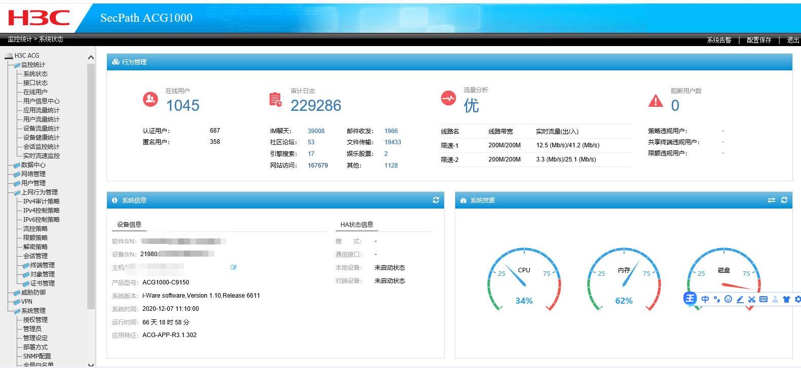 单位有台H3C ACG1000设备,最近一段时间查看,磁盘使用率特别高,请问一下,是怎么回事
