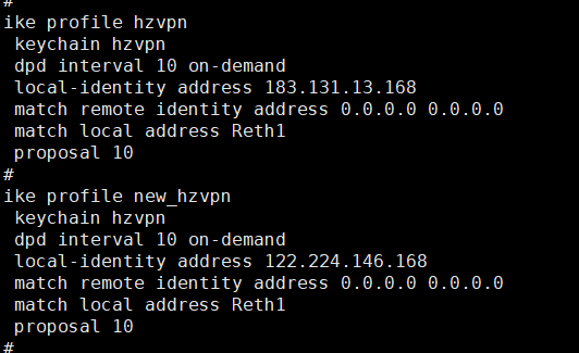 看截图两个vpn的match remote identity address都是全0,这个也都要写成明细地址,要不都命中一个了,其他配置也是 一样,必须两个区分开。