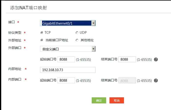 nat server protocol tcp global current-interface 8088 inside 192.168.10.73 8088