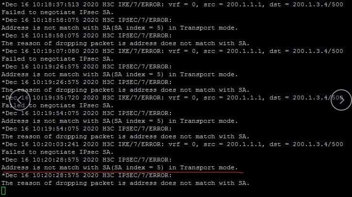 因为传输模式仅仅是加密应用层报文,所以原始报文的源目IP不会变化,因此IPsec的保护流源IP是FW1公网口地址,目的IP是FW2的公网口地址。IPsec建立起来后,只有保护流可通。PC1与PC2是不可达的,debug提示就如上图所示,此是正常现象。
