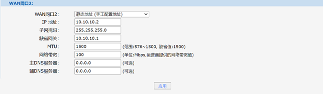 #“高级选项”-“静态路由”中新建一条静态路由,目的ip地址填IP专网的网段10.10.20.0/24,下一跳地址填写和WAN2口专线互联的对端地址10.10.10.2。