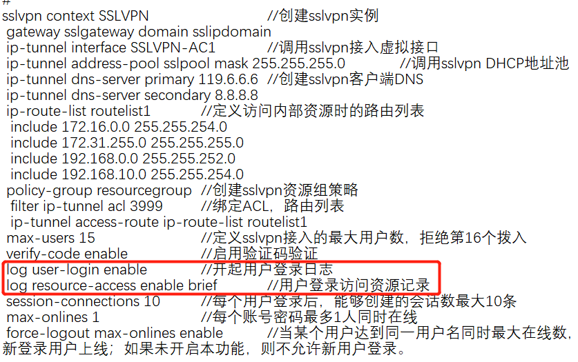 web页面没有找到在哪里开启ssl vpn的日志选项,但是命令行倒是可以开启,开启过后就在系统-日志里面可以找到相关的SSLVPN用户登录记录的