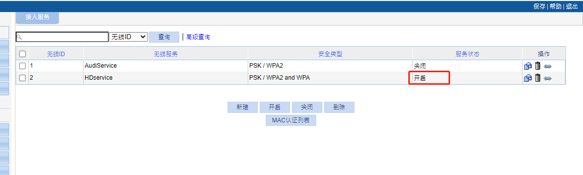 #选择“无线服务”>“接入服务”,选中“xiaobei722s”前的复选框,单击“开启”按钮完成。