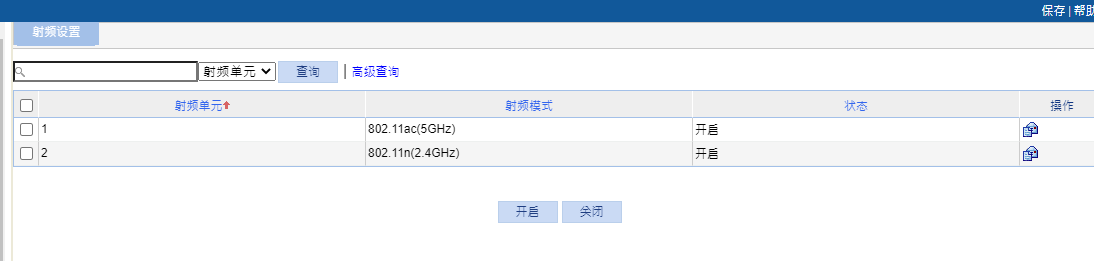 选择“射频”>“射频设置”,进入射频设置页面,确认所有射频处于开启状态。