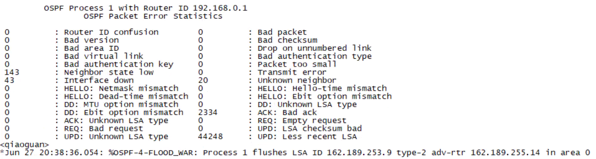 *Jun 27 20:36:31.777: %OSPF-4-FLOOD_WAR: Process 1 flushes LSA ID 162.189.253.17 type-2 adv-rtr 162.189.255.14 in area 0Request time out Request time out