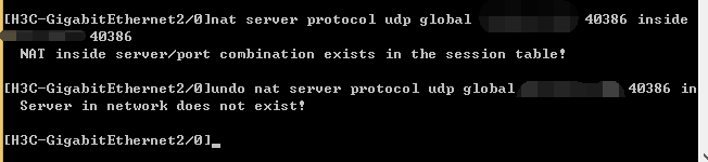 确认下,你输入的是display this 40386这个命令?在接口下,interface g2/0,进入到接口视图后,再敲display this,看下inside x.x.x.x 40386这个内网地址和端口是不是有其他的映射关系存在?另外,也确认下,这个inside 地址和端口在其他端口有没有存在映射关系?