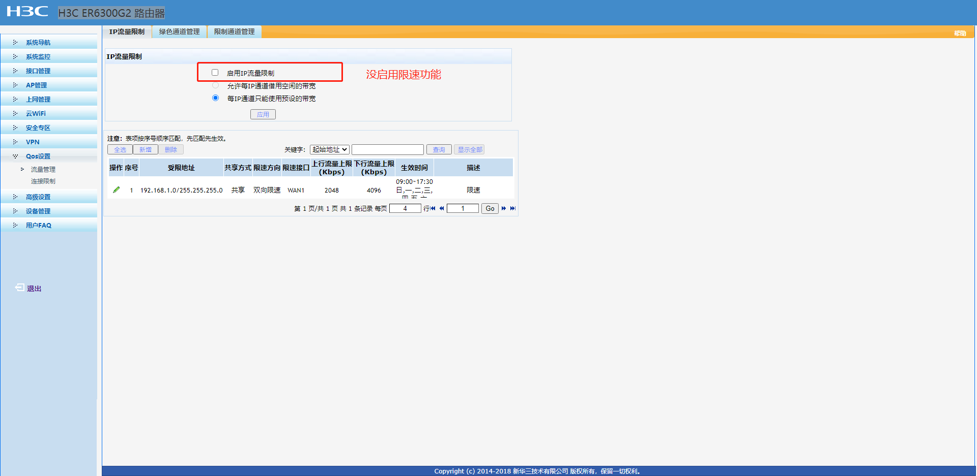 H3C ER6300G2 路由器 当前内置软件版本: ERHMG2-MNW100-R1117限速配置: