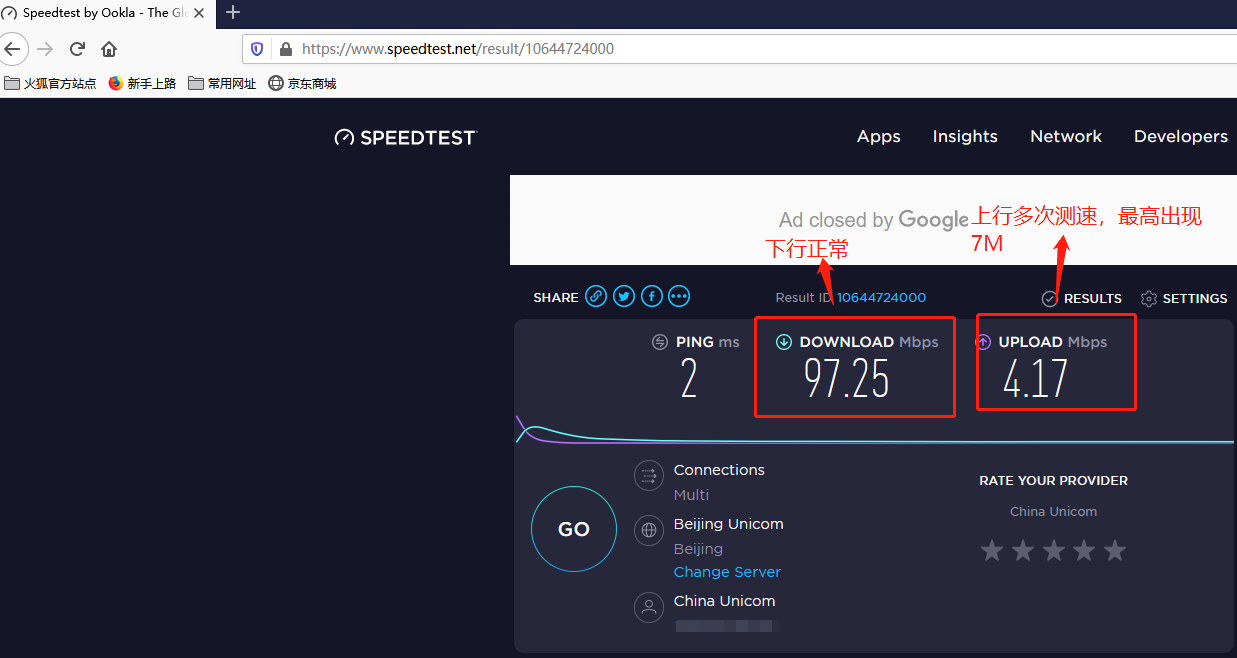 问题:联通运营商网络工程是专门来测试,上下行都是100M,但是只要一经过路由器上行就降低10倍左右。