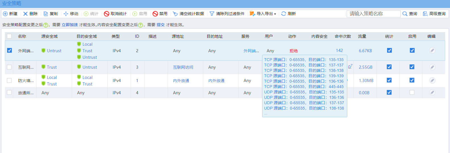 想拒绝外网来访问内网的一些端口,我在服务里面加了目的端口23 这样做了为什么还是限制不到外网使用telnet访问到防火墙呢