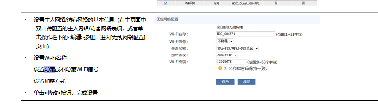 · 设置主人网络/访客网络的基本信息(在主页面中双击待配置的主人网络/访客网络表项,或者单击操作栏下的<编辑>按钮,进入[无线网络配置]页面) · 设置Wi-Fi名称 · 设置隐藏或不隐藏Wi-Fi信号 · 设置加密方式 · 单击<修改>按钮,完成设置 |