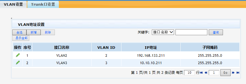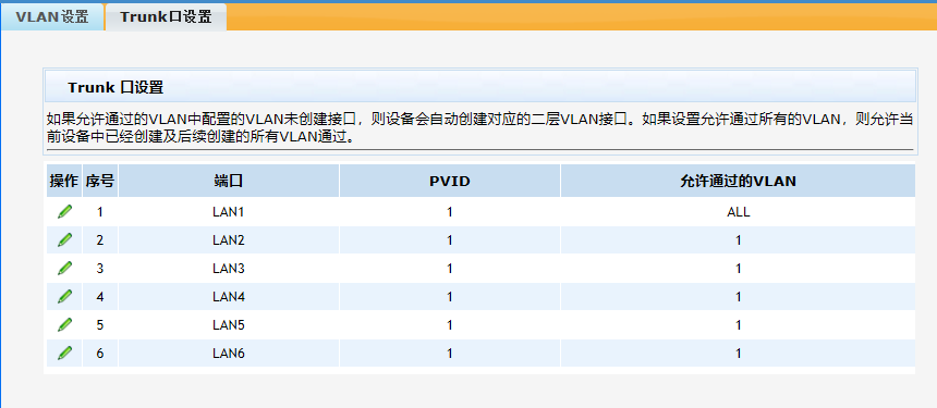 页面向导:接口管理→VLAN设置→Trunk口设置