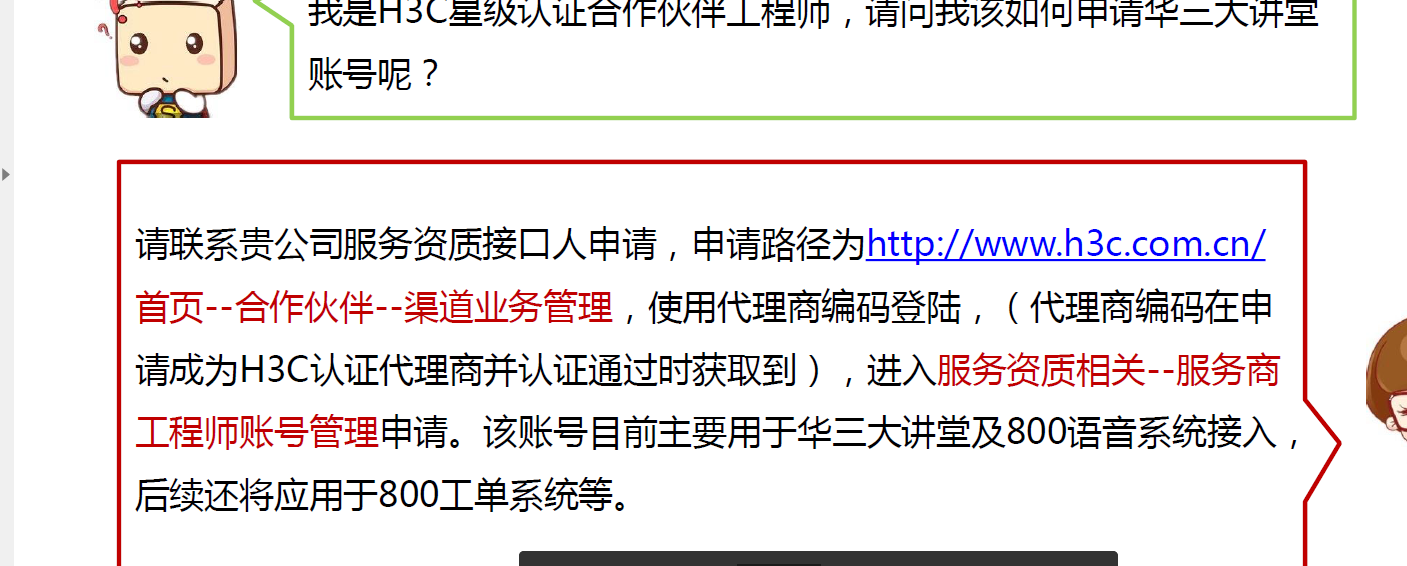 我想申请个华三大讲堂售后账号,怎么申请,现在首页的合作伙伴下没有渠道业务管理啊?