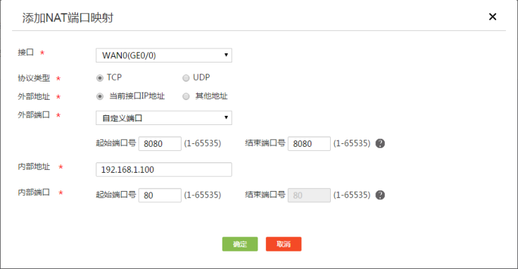dialer是拨号口,地址不固定的,如果需要一直端口映射成功,需要做域名解析,就和固定接口上网的一样配置即可 # 进入接口 Dialer1。 <Router> system-view [Router] interface dialer 0 # 配置内部FTP服务器,允许外网主机使用地址202.38.1.1、端口号21访问内网FTP服务器。 nat server protocol tcp global 202.38.1.1 21 inside 10.110.10.3 ftp # 配置内部Web服务器1,允许外网主机使用地址202.38.1.1、端口号80访问内网Web服务器1。 nat server protocol tcp global 202.38.1.1 80 inside 10.110.10.1 http # 配置内部Web服务器2,允许外网主机使用地址202.38.1.1、端口号8080访问内网Web服务器2。 nat server protocol tcp global 202.38.1.1 8080 inside 10.110.10.2 http # 配置内部SMTP服务器,允许外网主机使用地址202.38.1.1以及SMTP协议定义的端口访问内网SMTP服务器。 [Router-GigabitEthernet2/0/2] nat server protocol tcp global 202.38.1.1 smtp inside 10.110.10.4 smtp