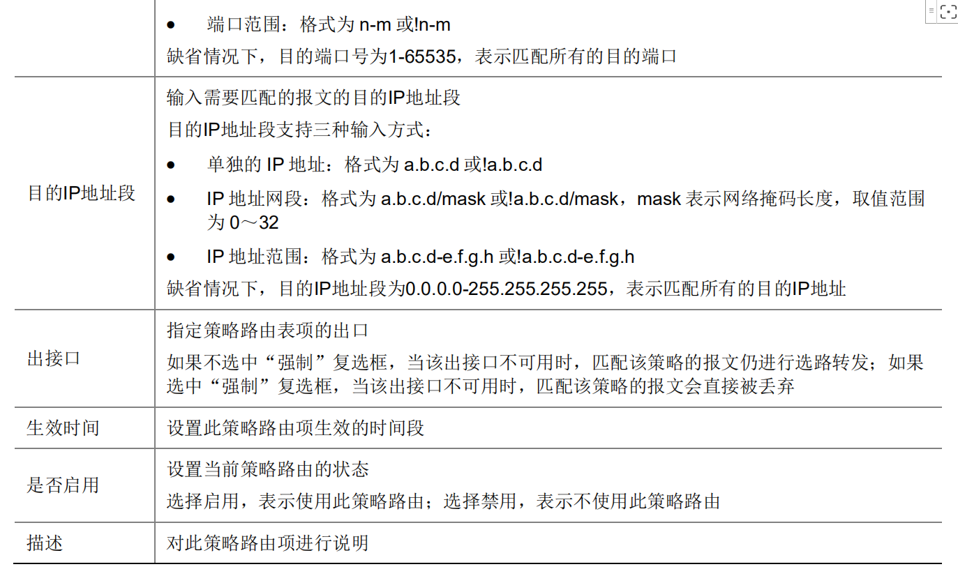 出接口 | 指定策略路由表项的出口 如果不选中“强制”复选框,当该出接口不可用时,匹配该策略的报文仍进行选路转发;如果选中“强制”复选框,当该出接口不可用时,匹配该策略的报文会直接被丢弃 |