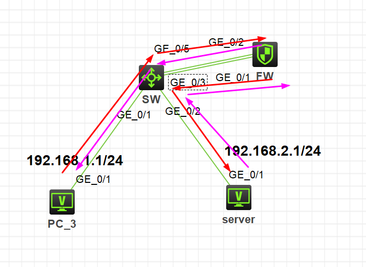 如下图PC3去访问sever时让流量经过防火墙再到server,sever访问PC3时也需要经过防火墙再到PC3,需要在交换机SW怎么配置呢?最好有个案例。