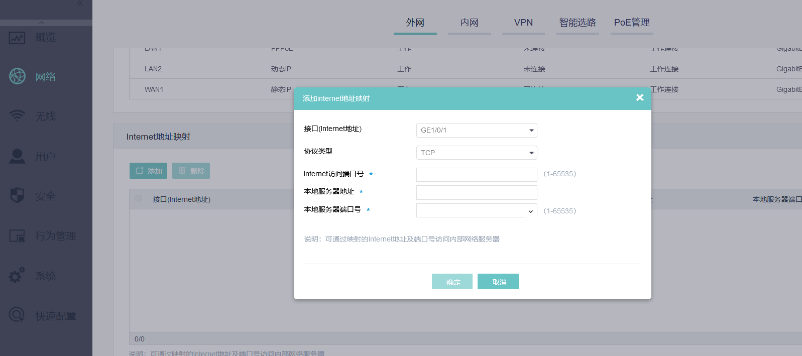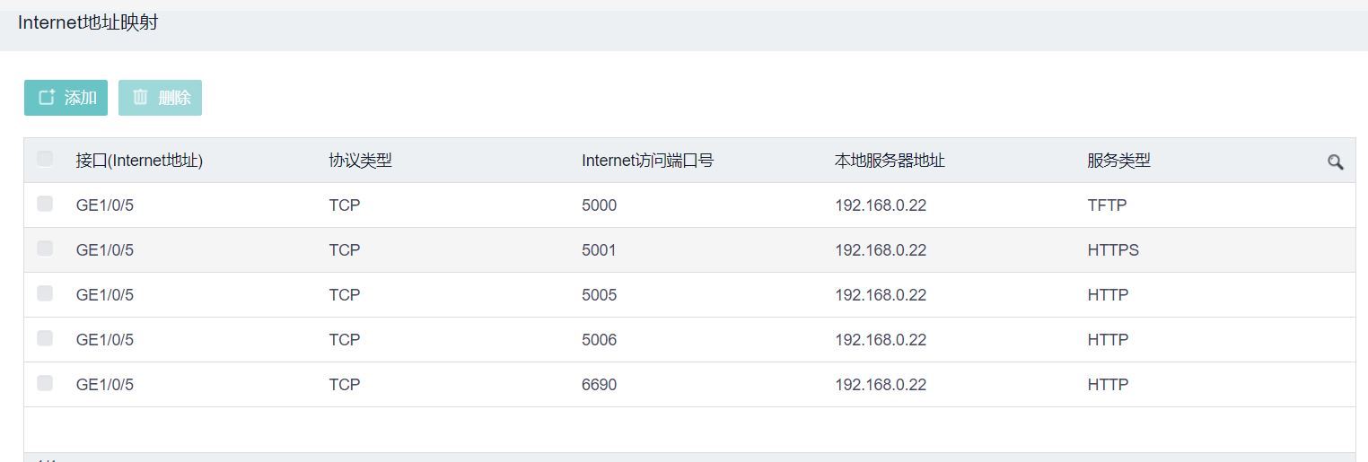(1)      在“NAT配置”页面,点击<添加>按钮,可以配置内网服务器与外网接口的映射关系;