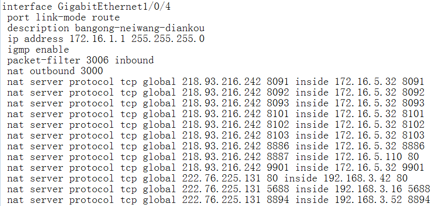 如图所示的配置,想了解一下,一般nat outbound 3000都是用在外网的接口上做nat转换,是不是这个地方是为了内网用户通过公网也可以访问内部的服务器,那么内网端口这个nat outbound应该如何理解!