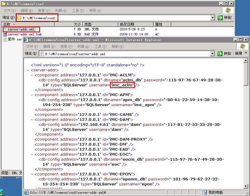 iMC数据库信息可以在common\conf\server-addr.xml文件中找到。该文件中的password为经过加密后的数据库密码,如图3-4所示。