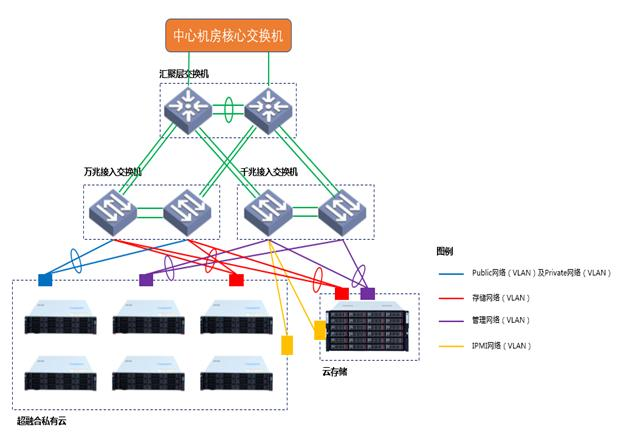 没两台交换机做堆叠然后万兆接入和千兆接入做聚合到万兆汇聚到交换机上,万兆交换机做聚合到服务器上,聚合模式是dynmic 服务器上聚合是802.3ad交换机的1/0/1和2/0/1是聚合成一个口单数是业务网双数是私网
