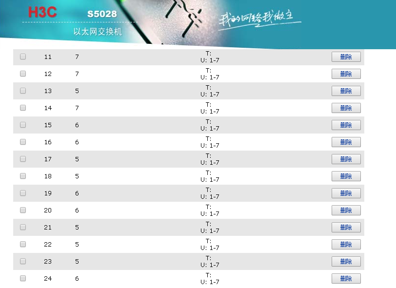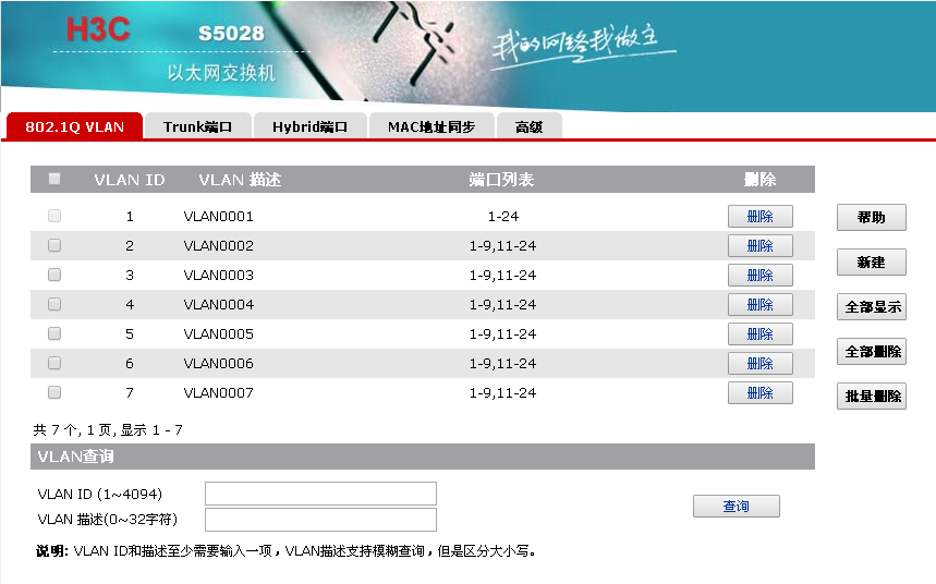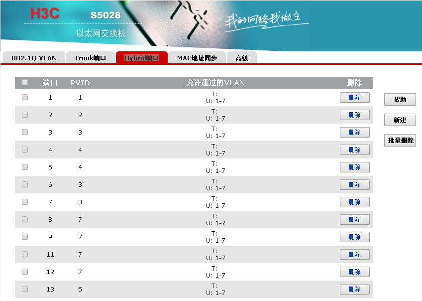 一共划分了七个VLAN,每个VLAN下有若干个端口,并通过设置Hybrid,使所有端口互通互访。