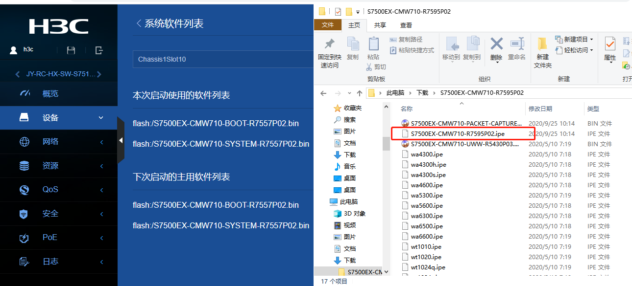 请问两台S7510E核心做堆叠的,要升级版本,官网下载最新版本,在WEB界面直接升级总是不行,也没报错,版本没找错呀,是不是IRF后不支持直接把软件导入升级呀