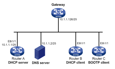 Router B和Router C分别作为DHCP客户端和BOOTP客户端,从DHCP服务器Router A获取静态绑定的IP地址、域名服务器、网关地址。