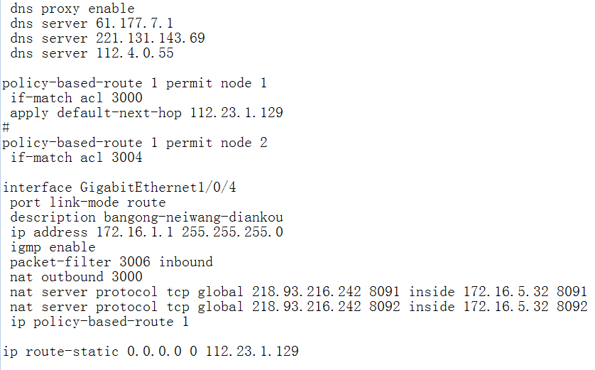 如图部分配置,我们防火墙开启了DNS代理(所以我PC的DNS设置的是防火墙上的一个内网接口的地址),同时也有策略路由,为什么我将ip route-static 0.0.0.0 0 112.23.1.129这条静态路由去掉之后,我的PC就没法通过www.baidu.com这个域名去访问网址及其他的域名(ping百度的ip地址是通的),但是在重新设置PC的DNS为112.4.0.55(运营商的)之后就可以正常访问百度以及其他的。