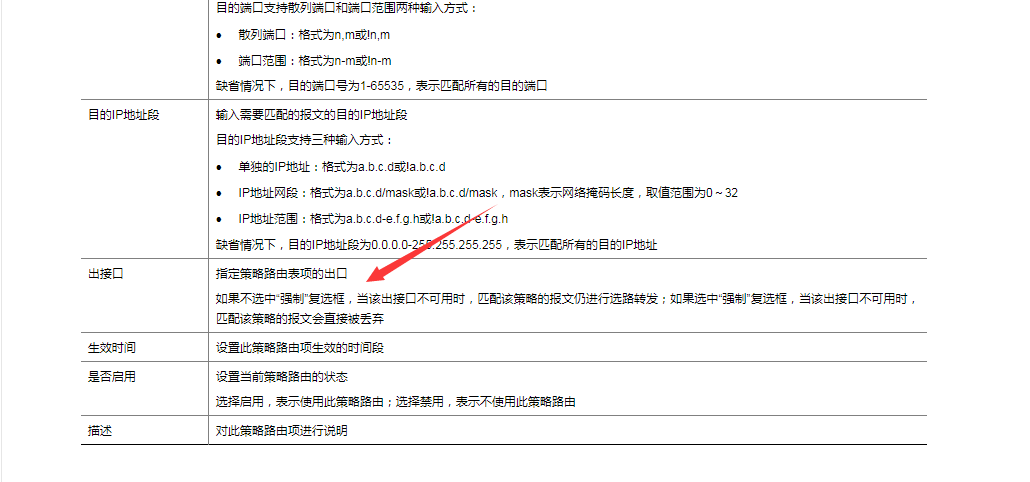 出接口 | 指定策略路由表项的出口 如果不选中“强制”复选框,当该出接口不可用时,匹配该策略的报文仍进行选路转发;如果选中“强制”复选框,当该出接口不可用时,匹配该策略的报文会直接被丢弃 |
